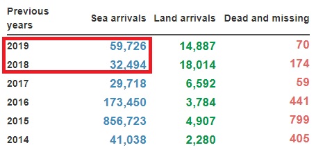 Enligt en rapport från FN:s flyktingorgan UNHCR har de grekiska öarna tagit emot nästan 60 000 migranter via havsvägen bara under år 2019. Det är nästan en fördubbling mot vad som rapporterades år 2018.