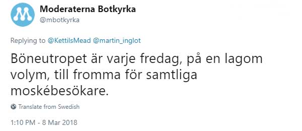 – Sedan förstår ju jag att en sådan tweet kan reta upp folk som är emot böneutrop utifrån olika bevekelsegrunder. Man får ha respekt för den typen av åsikter också.