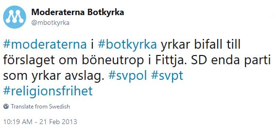 Moderaterna i Botkyrka tar nu avstånd från fem år gamla hånfulla inlägg på Twitter som riktades till dem som var kritiska till böneutrop från moskéer. Det säger Willy Viitala, politisk sekreterare för M i Botkyrka, till Samhällsnytt.