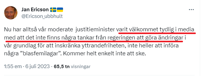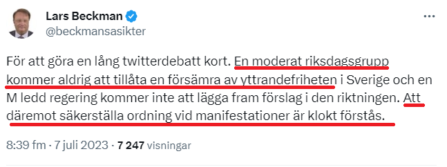 Lars Beckman, moderat riksdagsledamot, skriver på Twitter att Moderaterna aldrig kommer tillåta en försämring av yttrandefriheten i Sverige. Han skriver även en M-ledd regering inte kommer att lägga fram förslag i den riktningen. Men där slutar det inte.