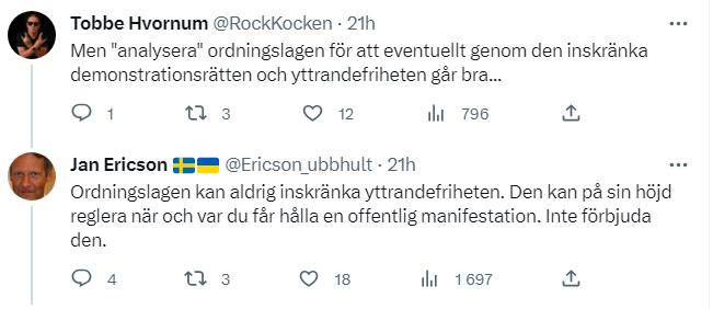 Detta efter att Polismyndigheten och Säkerhetspolisen själva tog sig friheten att inskränka yttrandefriheten med hänvisning till hotbilden som uppstår när muslimer blir kränkta. Samtidigt har även Turkiets president Recep Tayyip Erdogan varit tydlig mot den svenska regeringen – ”inget Nato så länge min heliga bok bränns”.
