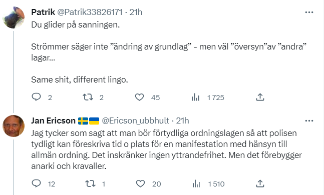 En annan person framför att ”analysera ordningslagen” kan innebära utökade möjligheter för polisen att därmed inskränka yttrandefriheten. Ericson svarar att polisen ska kunna styra i vilka delar av landet och när det finns yttrandefrihet. Men att det ”aldrig kan inskränka yttrandefriheten”.