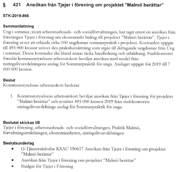I juni beslutade Malmös kommunstyrelse att bevilja nästan en halv miljon kronor till föreningens projekt Malmö berättar. Beslutet togs förutom Stjernfeldt Jammeh av Roko Kursar (L) och Håkan Fäldt (M).