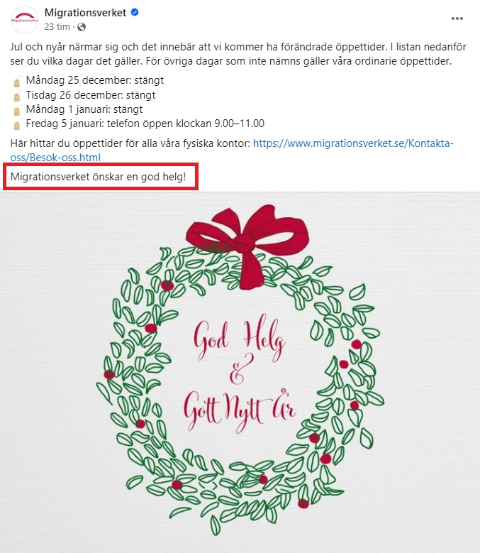 Dert är inte bara Malmö stad som börjat använda den nya hälsningen vid jul. Även Migrationsverket önskar ”god helg”.