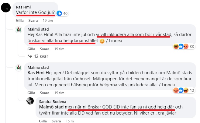 Malmö stad svarar, ”vi vill inkludera alla som bor i vår stad, så därför önskar vi alla fina helgdagar istället”.