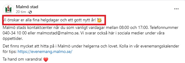 Inför julhögtiden har Malmö stad skickat ut en hälsning till invånarna. Kommunen önskar ”fina helgdagar och ett gott nytt år”.