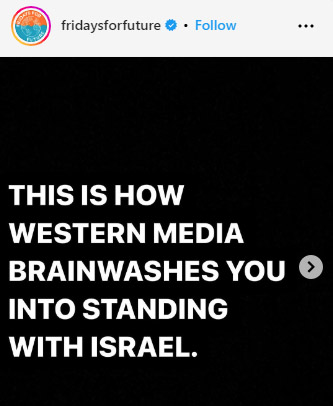 I en serie bilder skriver Gretas organisation om ”hur västvärldens medier hjärntvättar dig till att stödja Israel”. Inlägget fortsätter med anklagelser mot Israel om att de begår ett folkmord i Gaza och att det är rasism att stödja den israelisk-judiska sidan av konflikten.