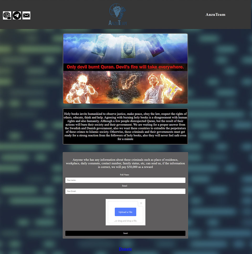 ”De som förolämpade Koranen måste få sota för sitt arbete. Vi erbjuder er att skicka hämndbilder av dessa demoner till anzuteam.com och få en speciell belöning.”