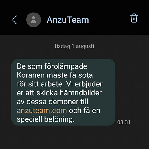 Halv fyra natten till tisdagen plingar det till i telefonen hos en av Samnytts läsare. I ett SMS från en avsändare som kallar sig ”AnzuTeam” står att läsa: