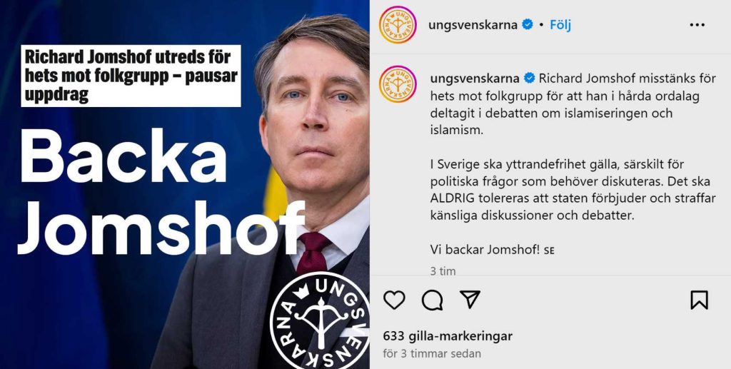 Sverigedemokraternas ungdomsförbund Ungsvenskarna ställer sig också bakom Richard Jomshof. På Instagram har man under fredagen publicerat ett inlägg med rubriken ”Backa Jomshof”.