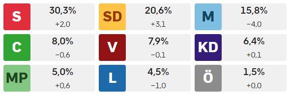 Precis som förra veckan är Sverigedemokraterna näst största parti medan Moderaterna fortsätter tappa röster. Enligt Novus vd Torbjörn Sjöström förlorar M röster till SD och KD.