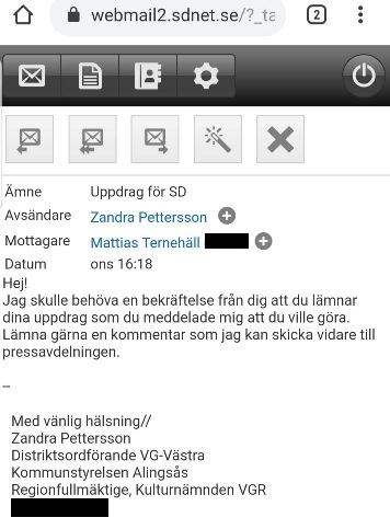 SD avvisar uppgifterna Vi har även tagit kontakt med SD pressavdelning för att höra huruvida Ternehälls uppgifter stämmer – att SD riks genom Pettersson har uppmanat honom att avsäga sig sina uppdrag eller annars riskera ett personärende.