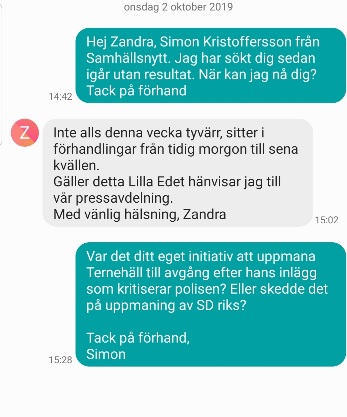 Det är en uppgift som är i linje med vad Ternehäll berättat för Samhällsnytt. Enligt honom är det Pettersson som har informerat honom om att pressavdelningen skulle ta ärendet vidare till medlemsutskottet om han inte frivilligt avsäger sig sina politiska uppdrag och tar en time-out.