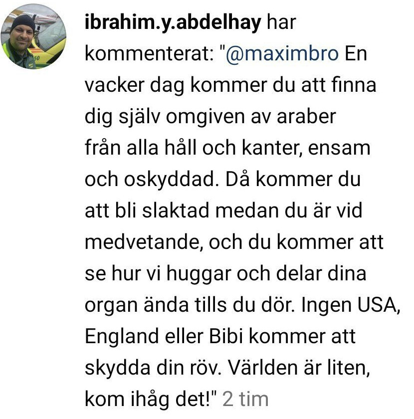 Det var 43-årige Max i Malmö som för snart två veckor sedan fick ett uppmärksammat meddelande på Instagram från en sjuksköterska. Texten innehåller formuleringar om ”att bli slaktad medan du är vid medvetande” samt ”du kommer att se hur vi huggar och delar dina organ ända tills du dör”. Nu berättar Max om händelsen.– Han tror att jag är jude, säger Max till Samnytt.