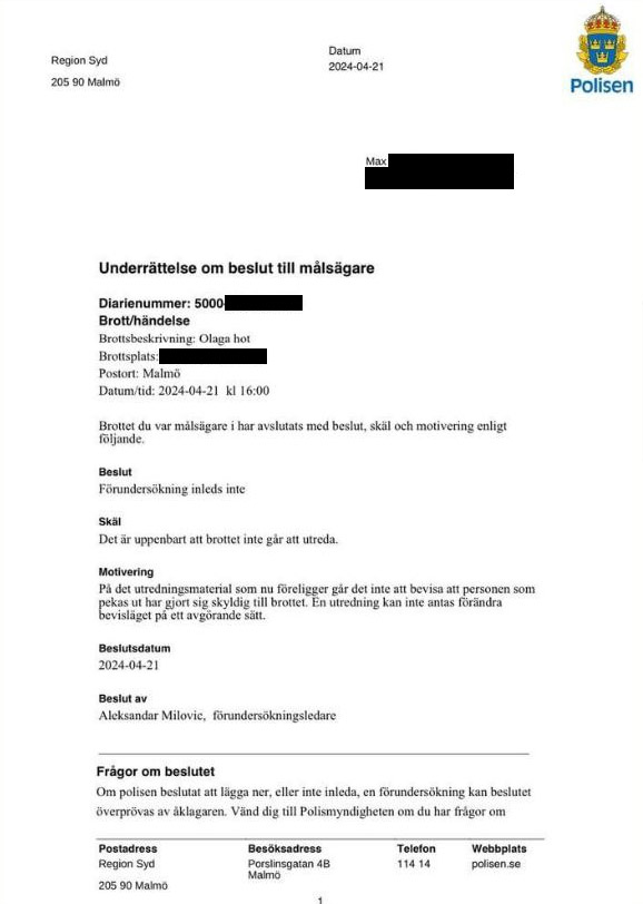 Under söndagen den 21 april ringer Max till polisen och anmäler Instagraminlägget. Anmälan läggs ned omedelbart, utan att någon brottsutredning inleds.