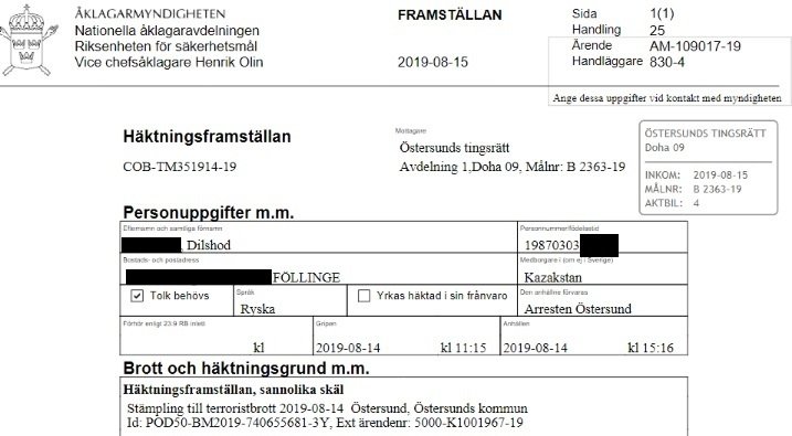 Den man som begärts häktad för stämpling till terroristbrott i Östersund är 32-årige asylsökaren Dilshod från Kazakstan. Samhällsnytt kan nu berätta att mannen tidigare har nekats uppehållstillstånd, gömt sig illegalt i landet och även uppmärksammats i ett snyftreportage i gammelmedia.