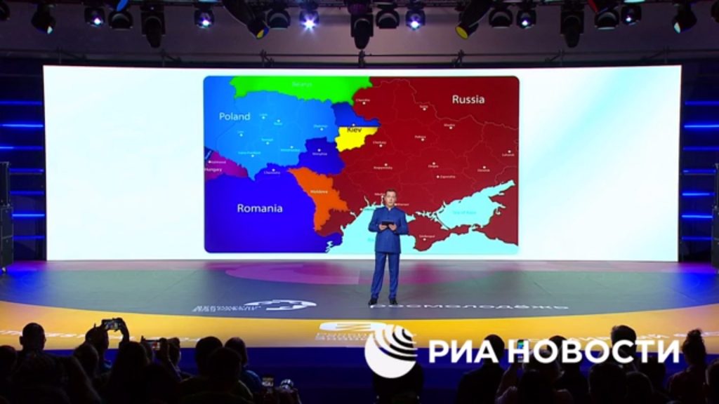 Medvedev visar med en karta upp sin vision för ett framtida Ukraina, där Ryssland kontrollerar de östra och södra delarna av landet, medan Polen och Rumänien lagt beslag på de västra delarna. En framtidsbild han delade redan 2022.