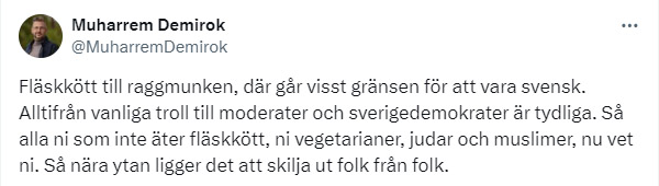 Centerpartiets partiledare Muharrem Demirok äter raggmunk utan fläsk. Det är en av veckans snackisar i sociala medier. Men när allmänheten ställer frågor om det, fräser C-ledaren ifrån. ”Fläskkött till raggmunken, där går visst gränsen för att vara svensk”, skriver han.