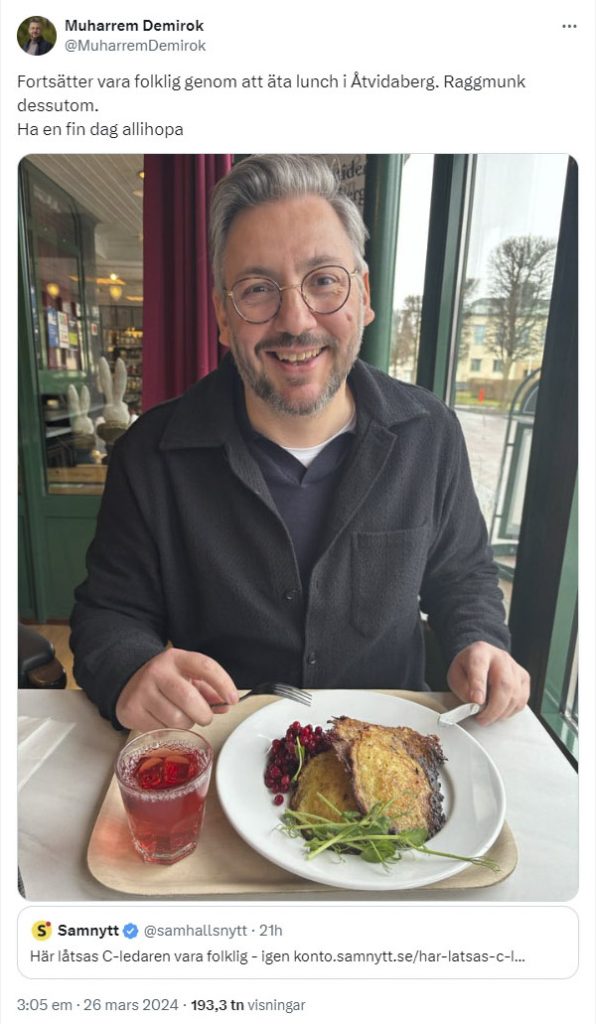 Fortsätter vara folklig genom att äta lunch i Åtvidaberg. Raggmunk dessutom. Ha en fin dag allihopa https://t.co/Em7XZXkNBk pic.twitter.com/yPGYTT50pq — Muharrem Demirok (@MuharremDemirok) March 26, 2024
