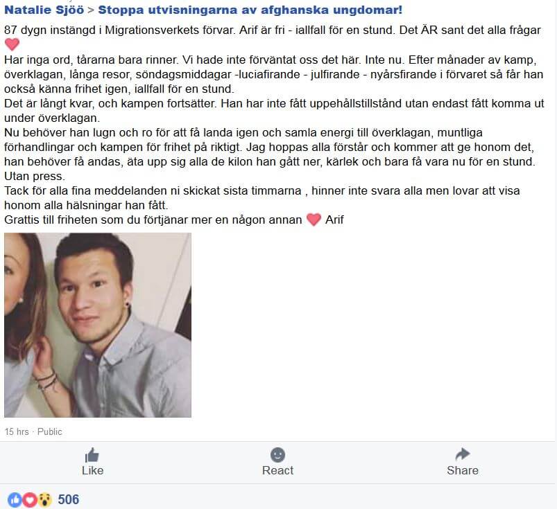 ”Det är långt kvar, och kampen fortsätter. Han har inte fått uppehållstillstånd utan endast fått komma ut under överklagan. Nu behöver han lugn och ro för att få landa igen och samla energi till överklagan, muntliga förhandlingar och kampen för frihet på riktigt.” ”Grattis till friheten som du förtjänar mer en någon annan ❤Arif”