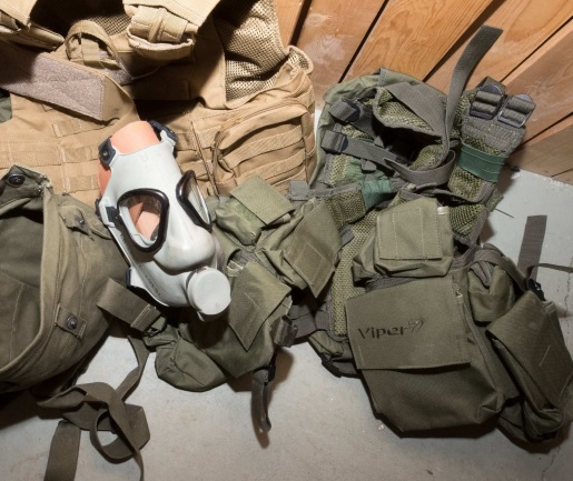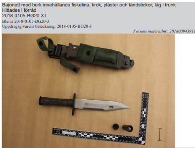 Stridsutrustning Säpo har påträffat väskor med bland annat skyddsvästar, bajonetter och gasmasker. Denna stridsutrustning ska enligt Idrisson varit avsedd för hans son som är ”intresserad av superhjältedräkter”.