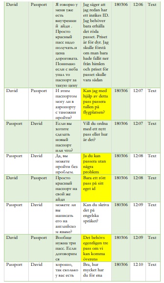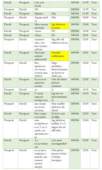 Han får svaret: ”Ja du kan passera utan några problem”. I ytterligare en chatt diskuterar man också att köpa pass med ”registrerade personnummer”, vilket uppges inte vara några som helst problem.