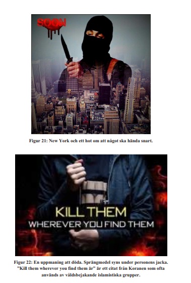Det förekommer även bilder på IS-terroristen och uzbeken Rakhmat Akilov som utförde terrordådet på Drottninggatan i Stockholm samt symboler om ett kalifat som sträcker sig över hela världen.