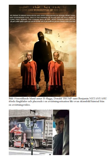 IS-propaganda och Rakhmat Akilov I de åtalades mobiltelefoner och datorer har man hittat mängder med IS-propaganda och annan islamistisk media föreställande terrorister och vapen. En bild föreställer USA:s president Donald Trump och Israels premiärminister Benjamin Netanyahu som ska straffas med avrättning.