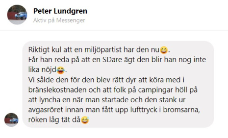 Alfsson skriver att bussen en gång i tiden varit i Sverigedemokratiske EU-parlamentarikern Peter Lundgrens ägo. En uppgift som miljöpartisten troligen inte känner till.