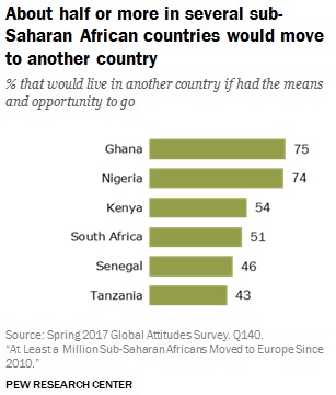 En studie som genomfördes 2017 visar att 75 procent av de tillfrågade i Ghana vill lämna landet. I Nigeria är den siffran 74 procent.