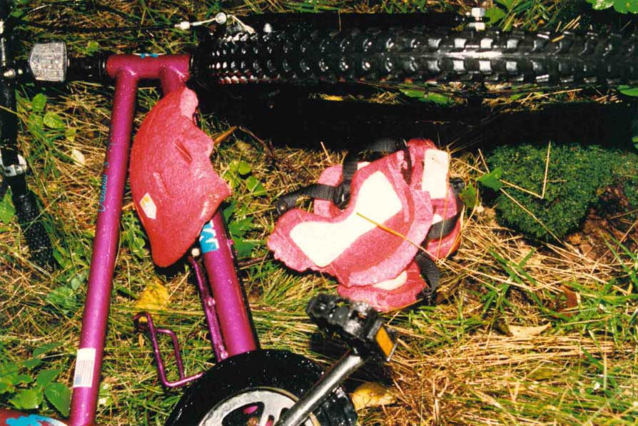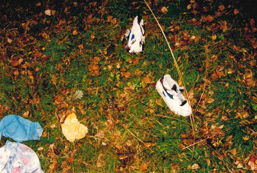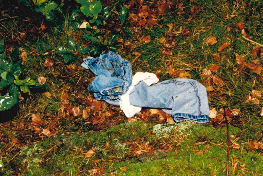 Bilder från förundersökningsprotokollet visar den lila flickcykeln omkullvräkt och hur Eriksson krossat flickans cykelhjälm vid attacken, slitit av henne kläderna och kastat dem och hennes skolväska åt olika håll på platsen innan han gick vidare med själva våldtäkten.