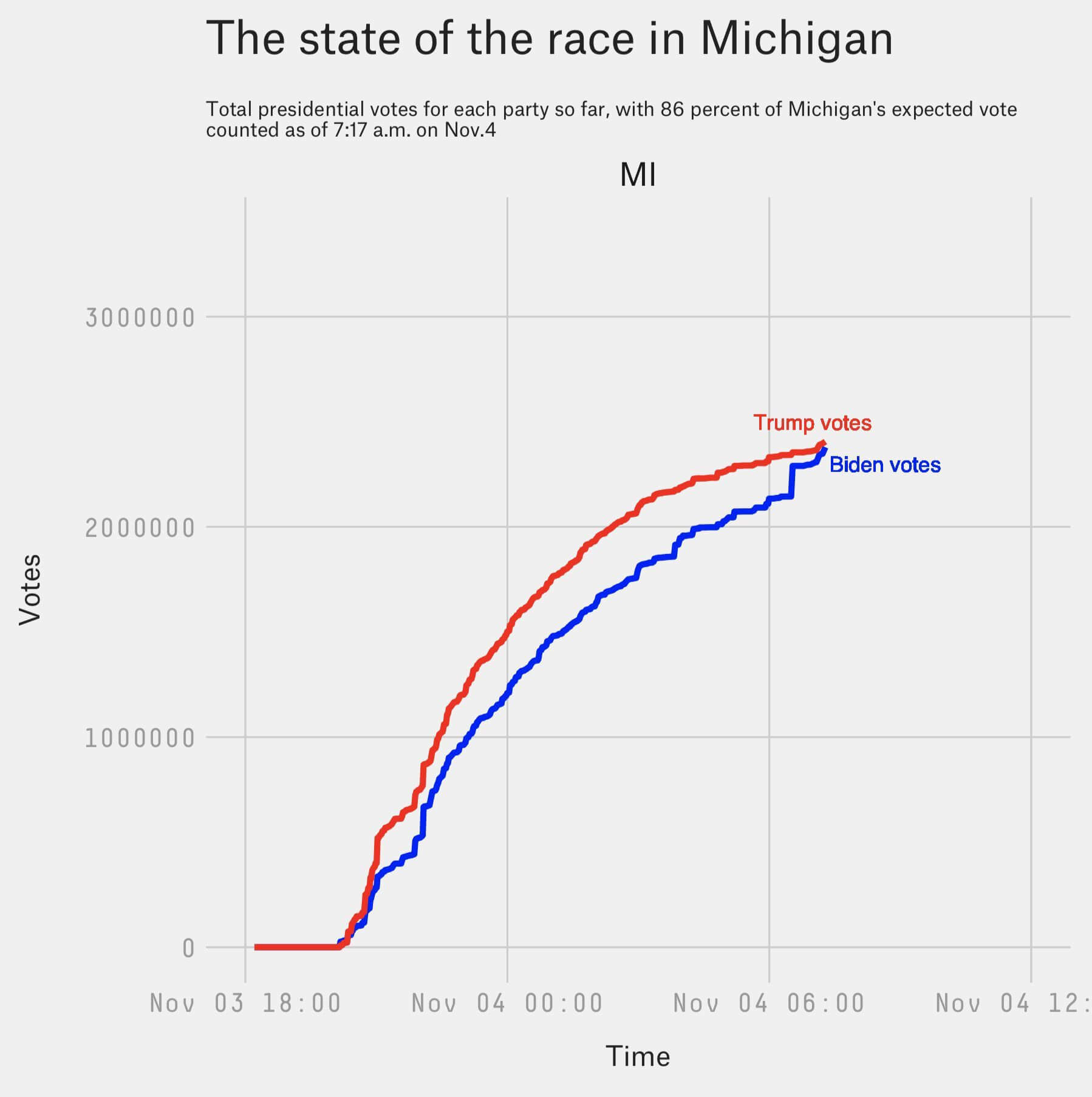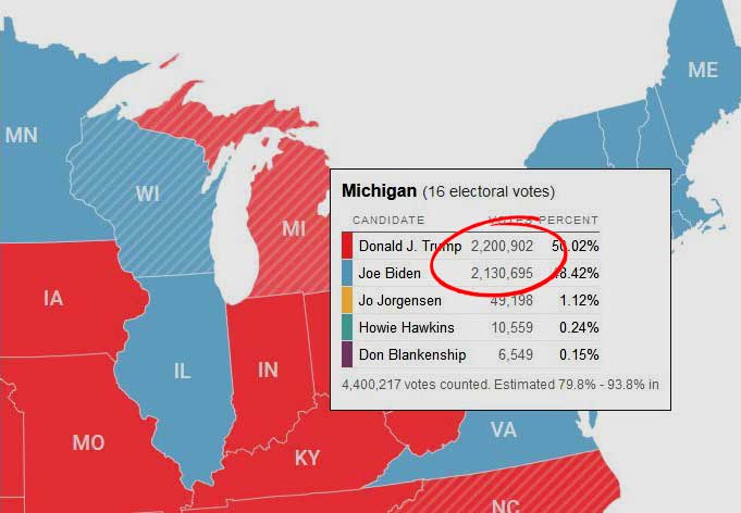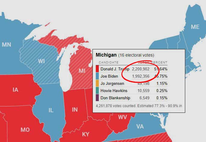 En utbredd uppfattning bland de som följer rösträkningen är att Bidens sena valframgångar kan handla om valfusk. Det är viktigt för Biden att vinna Michigan om han ska slå Trump.