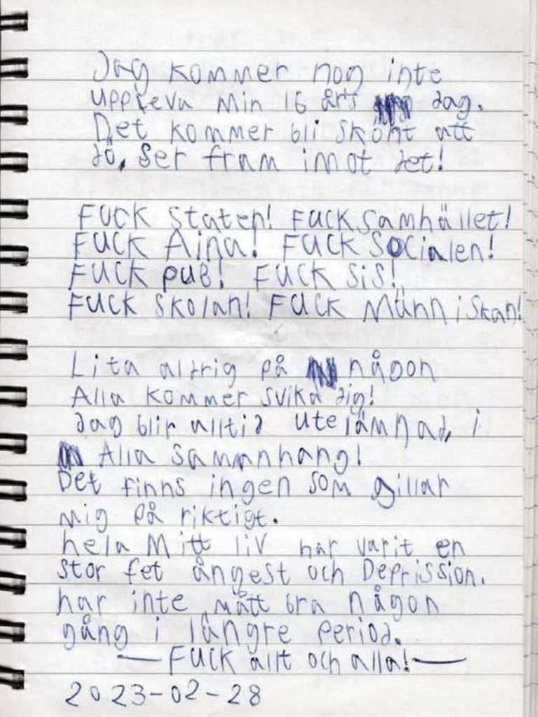 Vid en husrannsakan påträffas ett anteckningsblock där 16-åringen bland annat skriver ”Fuck staten! Fuck samhället! Fuck Aina! Fuck Socialen!”