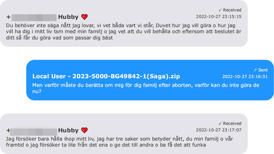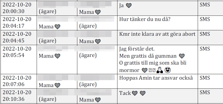 Textmeddelanden mellan Amin och Saga. Faksimil
