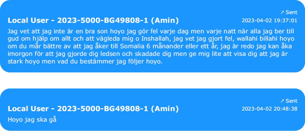 Under våren 2023 blir pressen från de somalisk-islamistiska hedersnormerna en allt tyngre börda för Amin. Han skriver en stor mängd textmeddelanden till sin mamma, ”hoyo”, där han berättar att han ber till Allah om hjälp och vägledning.