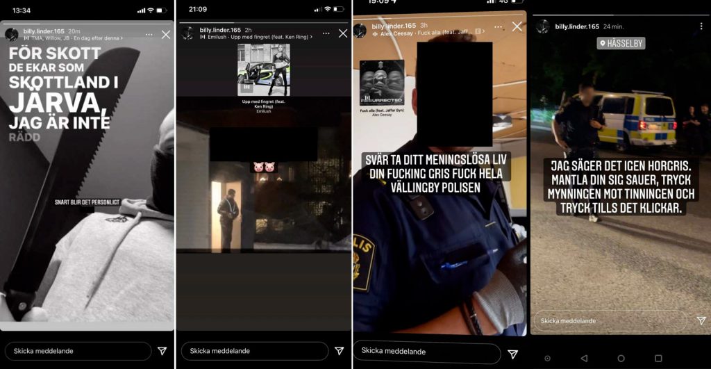 Hatet har i synnerhet riktats mot två polismän som arbetar i västra Stockholm. Billy Linder har bland annat publicerat den ena polismannens hemadress, uppmanat polismannen att skjuta sig själv och även lagt upp en bild på sig själv där han håller i en machete, följt av texten ”snart blir det personligt” och polisens förnamn.