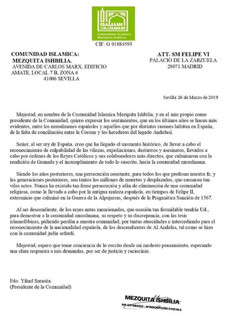 I ett uttalande som publicerats på moskéns Facebooksida kräver man att kung Felipe VI erkänner ”skuld för fördrivning och mord på order från katolska kungar”. Moskén kritiseras dock för att inte nämna den muslimska erövringen av Iberien sju sekel tidigare.