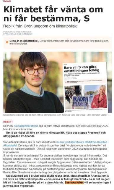 I texten hävdar Miljöpartiets ungdomsförbund att ”svenska folket vill se investeringar i järnväg, inte flygplatser”. Det är oklart om någon annan har polisanmält Ling för osant intygande på grund av detta generaliserande påstående.