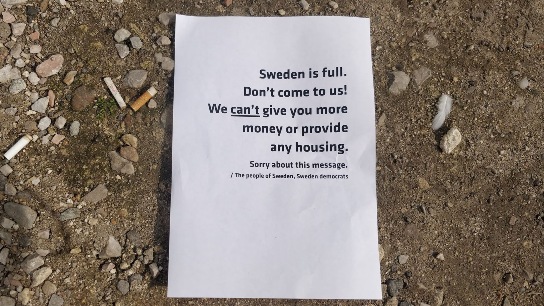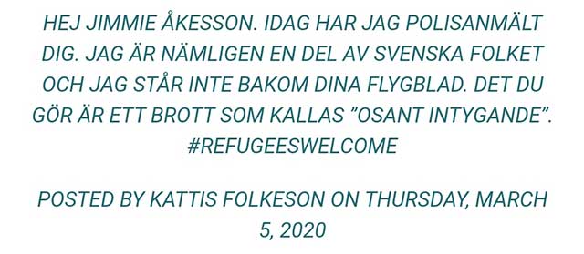 Miljöpartisten och asylanarkisten Katarina ”Kattis” Folkeson skriver att hon har polisanmält SD-ledaren Jimmie Åkesson för osant intygande efter att denne delat ut flygblad till migranter i Turkiet med budskapet ”Sverige är fullt” och undertecknat det i hela svenska folkets namn. Det visar sig däremot att Folkeson struntar i att polisanmäla när hennes partikamrater tar sig friheten att skriva samma sak.