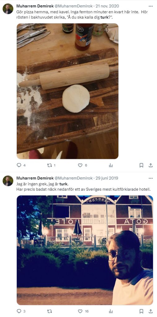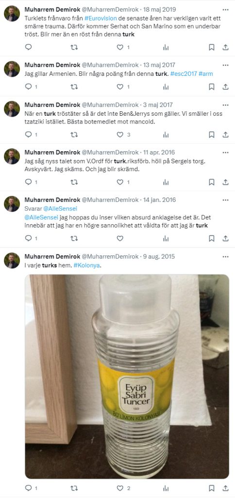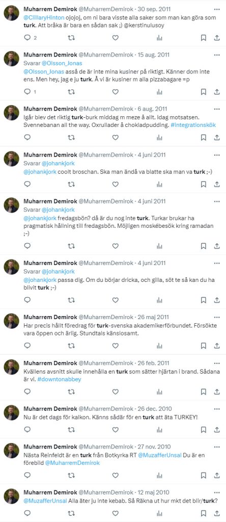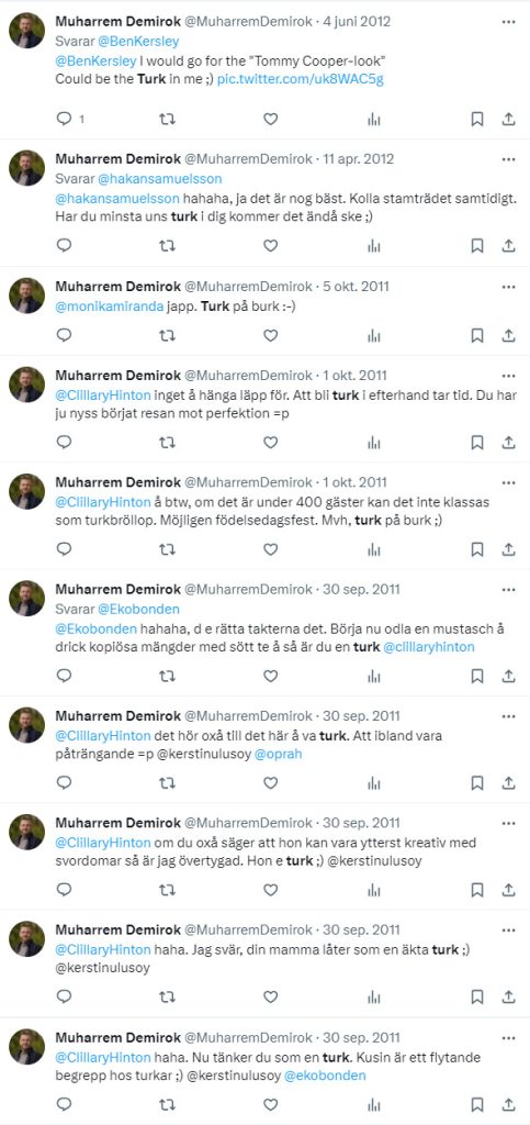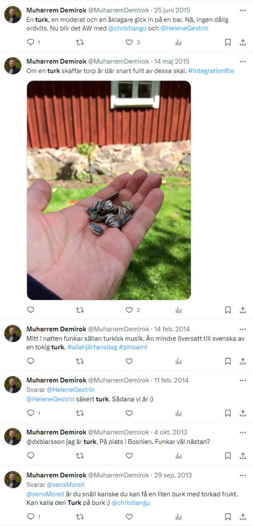 Samnytt har gått igenom och hittat ett 30-tal dylika inlägg på X, från det att Demirok klev in i toppolitiken som kommunalråd i Linköping 2009, fram till förra veckan. Bland annat kallar han sig själv flera gånger för ”turk på burk”. Som jämförelse har han tydligt refererat till sig själv som svensk vid färre än tio tillfällen.