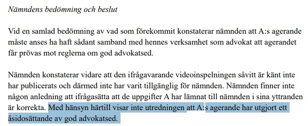 Men när Advokatsamfundets disciplinnämnd behandlade händelsen slog de fast advokaterna och de biträdande jurister som både arrangerade och medverkade i musikvideon ”inte åsidosatt god advokatsed”.
