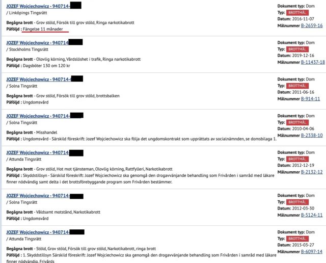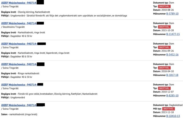 Rapartisten Wojciechowicz har dömts för för 13 brott varav flera grova stölder, däribland en som resulterat i fängelse. Vidare har han enligt rättshandlingar dömts för flera narkotikabrott, vapenbrott och hot mot tjänsteman.