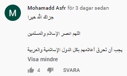 En person som gläds åt videomeddelandet är Mohamadd Asfr som menar att Allah ska belöna Sheikh Abu al-Abd Ashidaa, vidare ska islam och muslimer få sin seger. Fram till dess uppmanar han att svenska flaggan måste brännas i alla muslimska och arabiska länder.