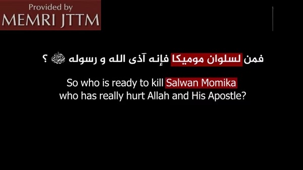 Vet, min muslimske bror, du som bor i Sverige, att Salwans aktion inte var den första och inte kommer att bli den sista, om du inte sätter stopp för det genom att döda honom. Vet också att den svenska polisens blod är ett rättvist mål att attackera, precis som att dricka vatten. Så utgjut deras blod, döda deras soldater, slå mot deras ekonomi var de än är. Underskatta inte vikten av att döda dem och bekämpa dem.