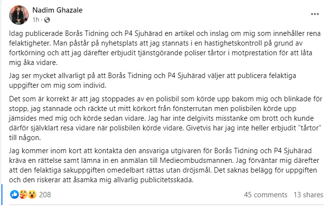 Den mediekände Boråspolisen Nadim Ghazale hävdar att avslöjandet om den fartkontroll han fastnade i förra månaden ”innehåller rena felaktigheter”, men erkänner att han ”stoppades av en polisbil”. Det skriver han på Facebook.