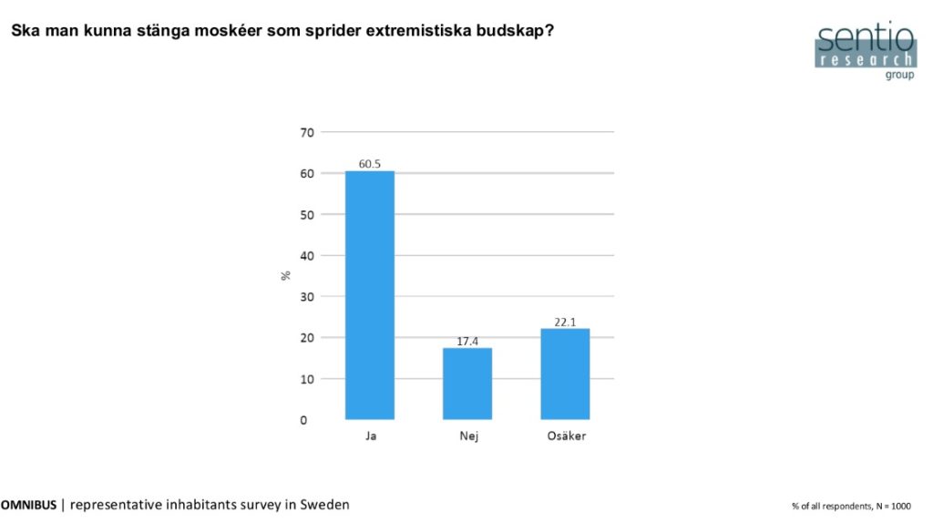 Hela 60,5 procent är öppna för att Sverige ska kunna stänga moskéer som sprider islamism och andra antidemokratiska budskap.
