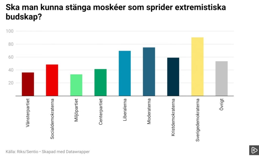 Bland M-väljare är det 74,8 procent som tycker att Sverige ska kunna stänga moskéer. 8,4 procent av M-väljarna säger nej till att stänga moskéer och 16,8 procent vet inte.