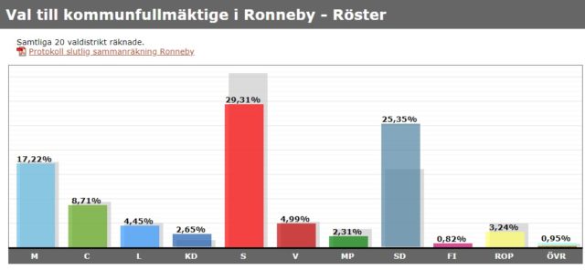SD växer kraftigt Vid valet förra året tappade Socialdemokraterna över sex procentenheter i kommunen. Samtidigt gjorde Sverigedemokraterna ett succéval med en ökning på över nio procentenheter.
