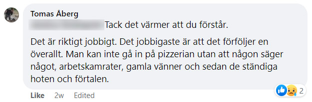 ”Det är riktigt jobbigt. Det jobbigaste är att det förföljer en överallt. Man kan inte gå in på pizzerian utan att någon säger något, arbetskamrater, gamla vänner och sedan de ständiga hoten och förtalen”, skriver han.