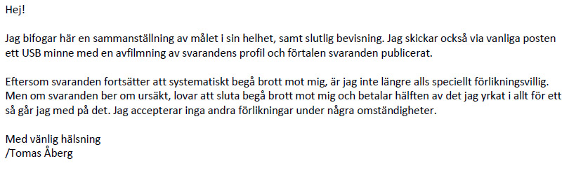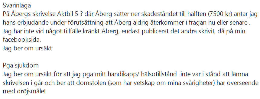 Åberg skickar 19 februari en inlaga till domstolen där han nöjer sig med att fattigpensionären betalar halva det yrkade beloppet, om hon ”ber om ursäkt” samt ”lovar att sluta begå brott mot” honom.